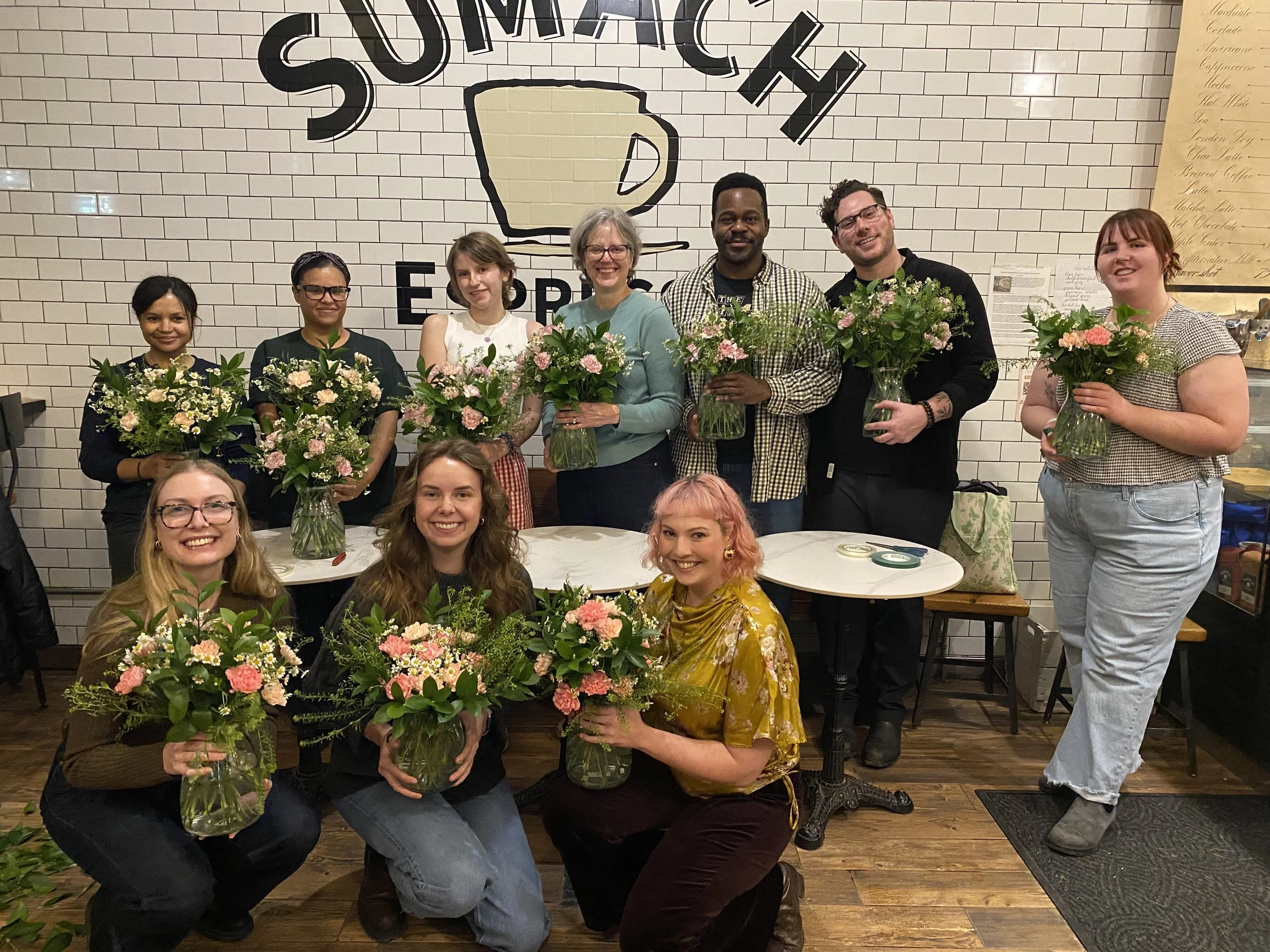 In April of 2025 I began my new floral design journey by selling grab-and-go bouquets to customers visiting the coffee shop where I work part-time. How lucky I have been to have such a supportive employer and team of coworkers to help me through the beginning phases of my career (Shoutout Sumach Espresso!). Networking through the coffee shop offered me several business opportunities including designing for a birthday party, an engagement party and even my first wedding! Word-of-mouth soon led to even more experiences, including a baby shower, a wedding shower, and a second wedding.